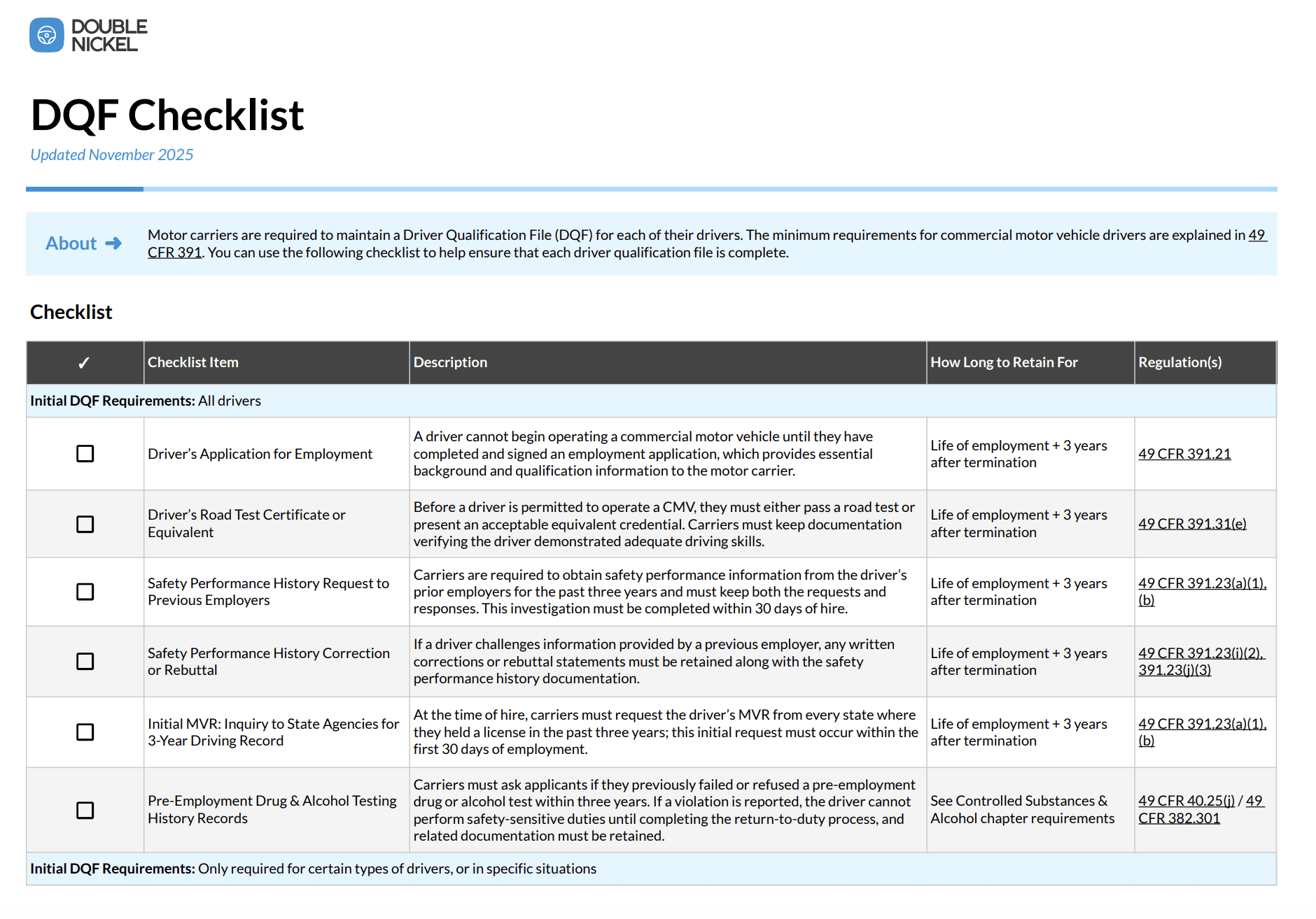 Ensure your driver qualification files are accurate, complete, and audit-ready with this DQF compliance checklist. This downloadable resource helps trucking fleets and recruiters verify required documents, reduce compliance risk, and stay aligned with FMCSA regulations.