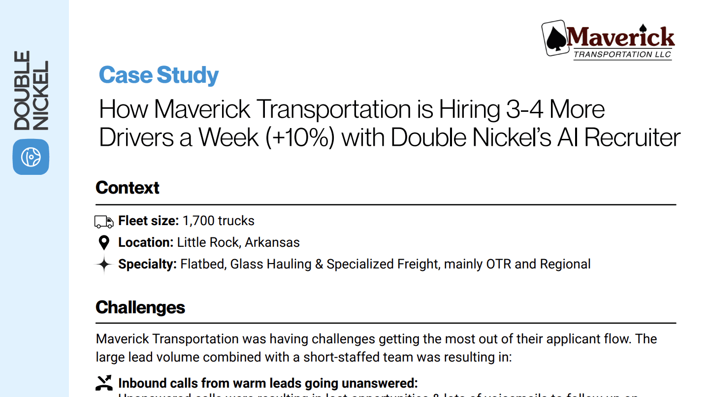 Maverick Transportation, a 1,700-truck fleet, used Double Nickel’s AI Recruiter to eliminate voicemails, automate outreach to short-form leads, and schedule qualified conversations — driving a 10% increase in weekly hires and a 13% lift in applications to processing without adding recruiting staff.